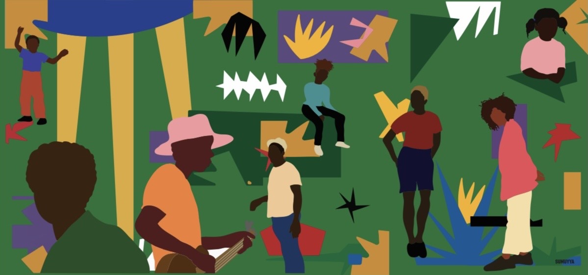 This mural highlights joy as strength and creativity as freedom. Across a green space people sing, move, rest, and connect, each moment filled with colour and rhythm. Music, dance and conversations flow, showing how everyday pleasures are meaningful and earned. The abstract shapes and bold colours suggest a culture always being created and shared.